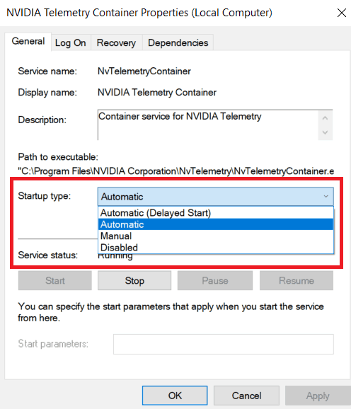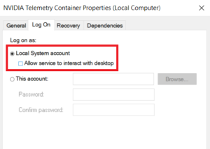3. Click on ‘Nvidia Telemetry Container’ and select ‘Properties’. In Properties, change from General to Log on Tab. Select the ‘Local system account’ and do check the ‘Allow service to interact with desktop’ below it.