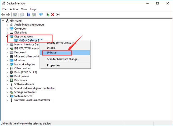 2. Under ‘Display adapters’, click on Nvidia Geforce entry and uninstall it.